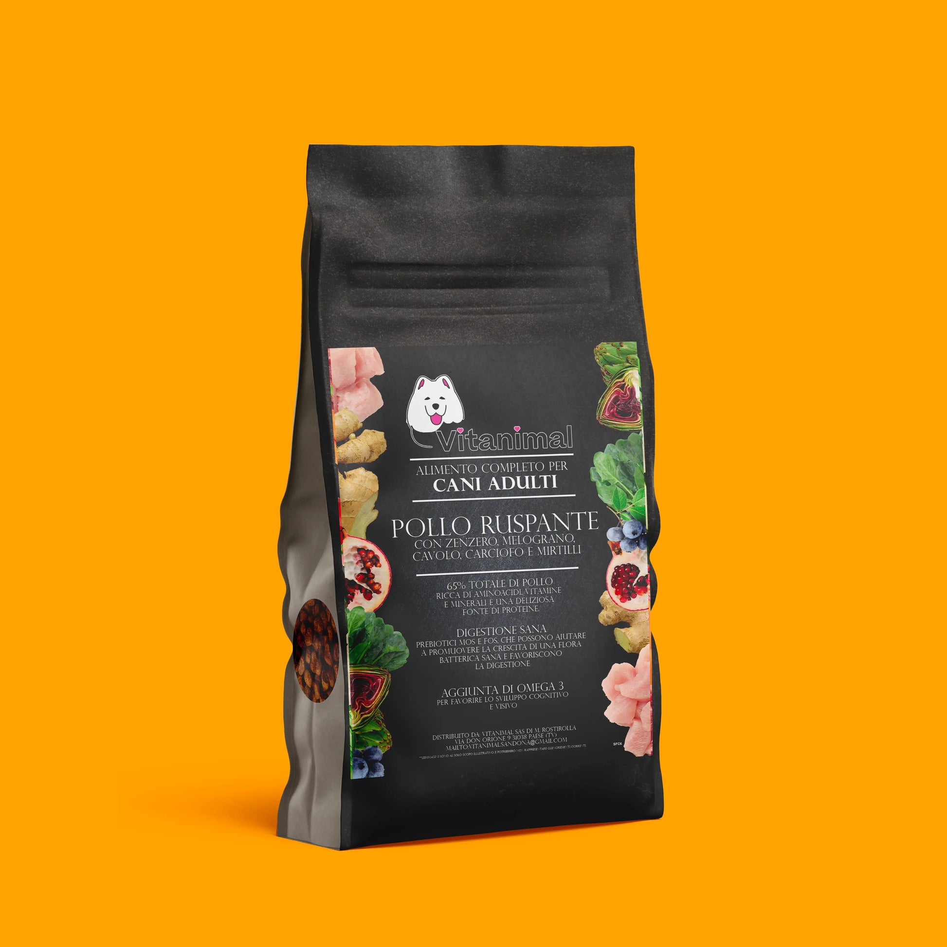 Ricetta completa con 65% pollo ruspante, proteina magra e facilmente digeribile. Arricchita con zenzero, melograno, cavolo, carciofo e mirtilli, ingredienti vegetali ricchi di antiossidanti e utili per la digestione. I prebiotici favoriscono l’equilibrio intestinale mentre gli Omega-3 aggiunti sostengono cute, pelo e benessere generale. Ideale come alimento quotidiano per cani adulti.