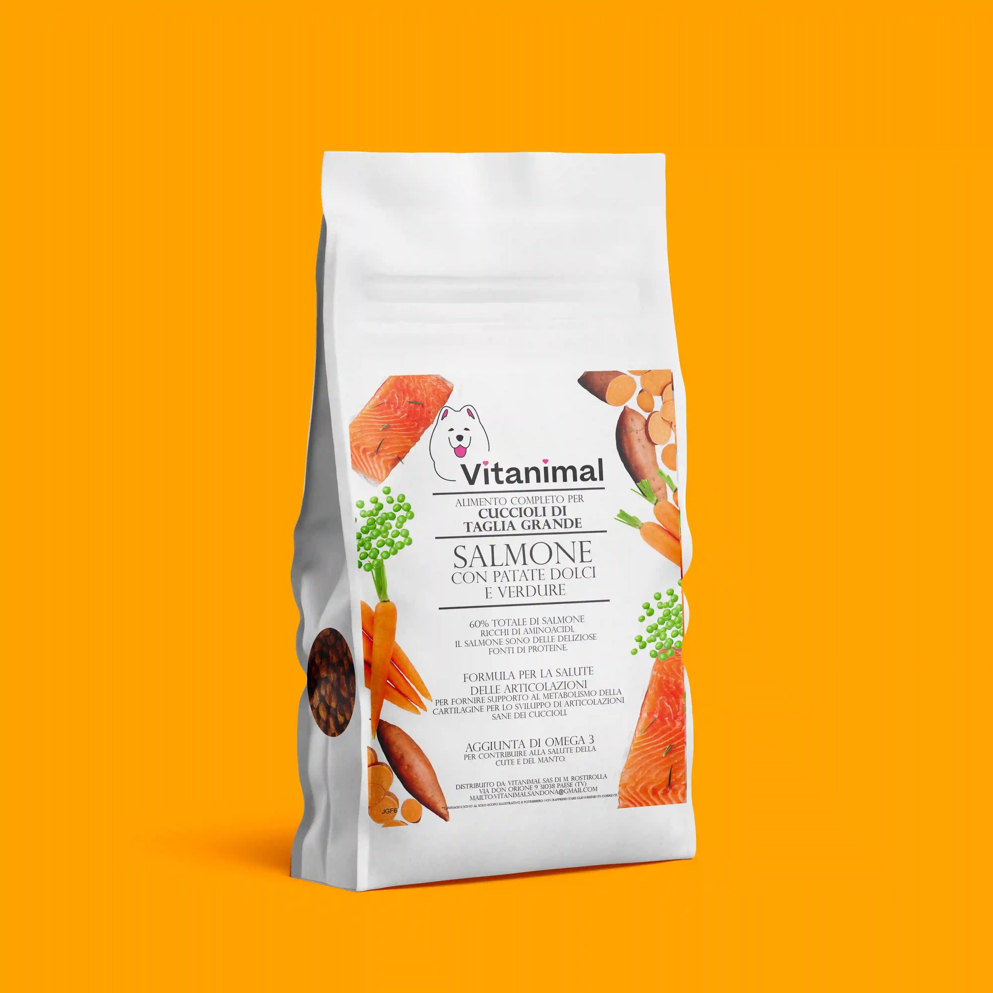 Menù completo con 60% di salmone, fonte proteica nobile e altamente assimilabile. La presenza di patate dolci e verdure selezionate favorisce una digestione graduale e un rilascio energetico costante. La formula è arricchita con Omega-3, fondamentali per supportare articolazioni, pelle e sistema nervoso, particolarmente sollecitati nei cuccioli di taglia grande.